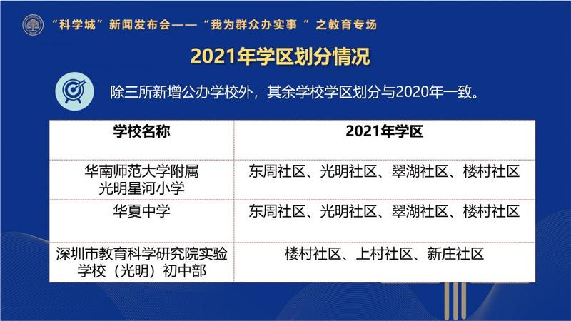 今年光明区除三所新增公办学校学区划分有变外,其他学校学区划分与2020年保持一致。三所新校学区划分为:星河小学、华夏中学学区为东周社区、光明社区、翠湖社区和楼村社区;市教科院实验学校(光明)初中部学区为楼村社区、上村社区和新庄社区。