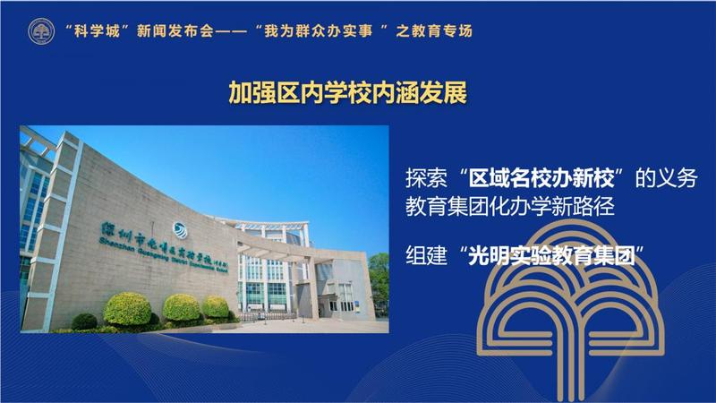 此外,光明加强区内学校内涵发展,以区内品牌学校区实验学校为龙头,探索“区域名校办新校”的义务教育集团化办学新路径,组建“光明实验教育集团”,承办华夏中学,使其在战略规划、学校管理、课程建设、教学改革、教师发展、“五育”并举等方面享有区实验学校的资源,共建品牌内核、品牌效应,进一步增强集团内学校的办学特色、办学活力和办学品质,扩充优质教育资源。