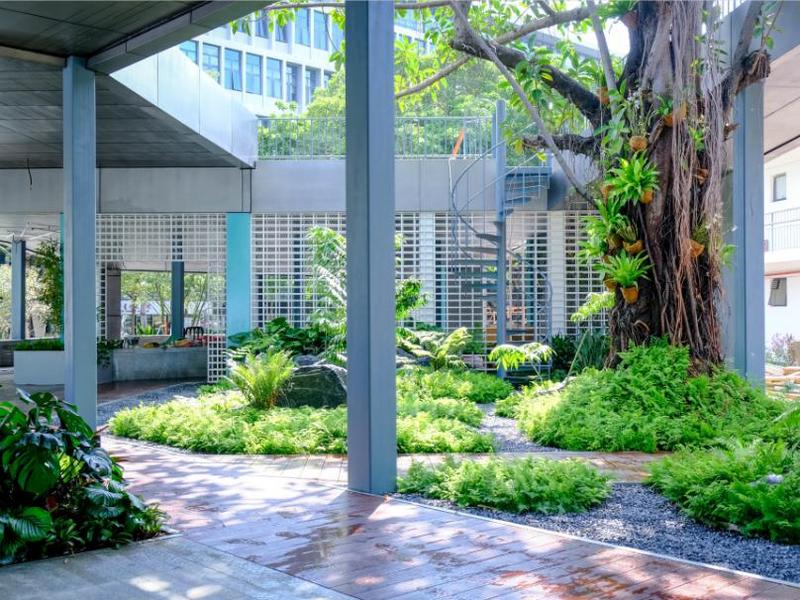 流水潺潺的草庐小游园、生态宜人的荔枝林……原本是乱草荒芜、废料堆砌之地,如今摇身一变为疏朗简朴的生态公园。这就是位于南山大道与北环大道交界东侧,紧邻深圳艺术学校的本草公园。