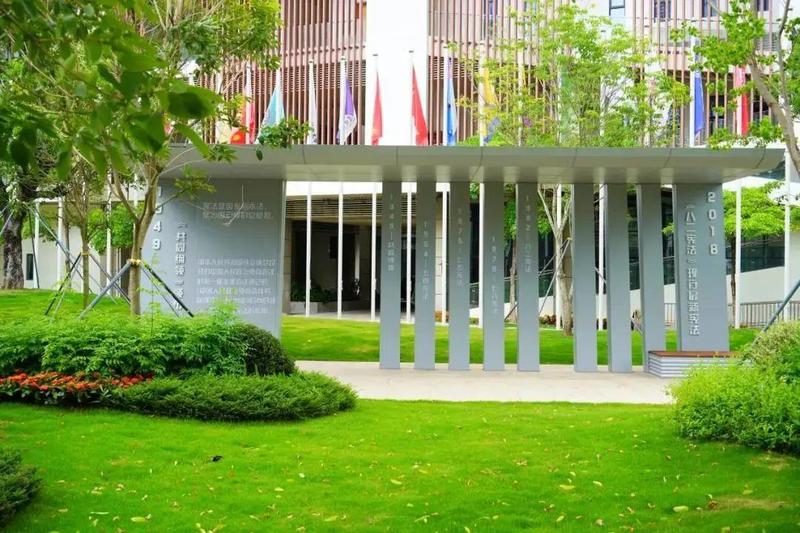该公园公园以“粤法(阅法)”为主题,彰显宪法精神与城市形象,景观将法治元素、自然景观和互动体验深度融合,通过宪法之廊、宣誓景墙、小品等艺术载体以现代简约的设计表达,移步易景,呈现了宪法公园普法、教育、纪念、互动、休憩、宣誓的功能,同时达到实现了现代都市的艺术效果。
