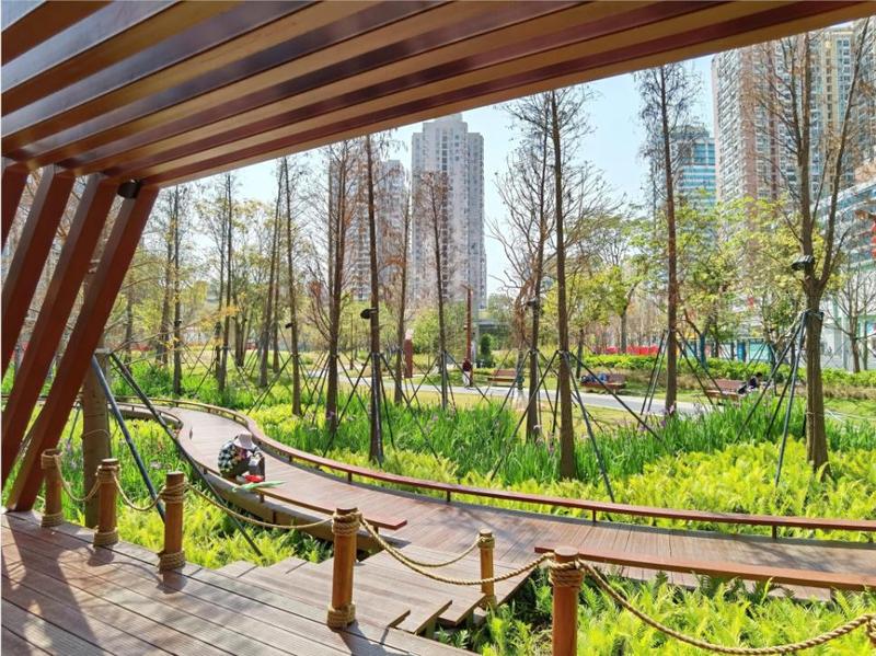 宽阔的阳光大草坪、精巧的林间树屋、蜿蜒流畅的木栈桥为市民游客提供舒适优美的全家户外活动的自然游乐场。此外,公园还规划设计生态环保的雨水花园,以雨水生态循环引导儿童对大自然的兴趣,直饮水、便民座椅等便民设施一应俱全。