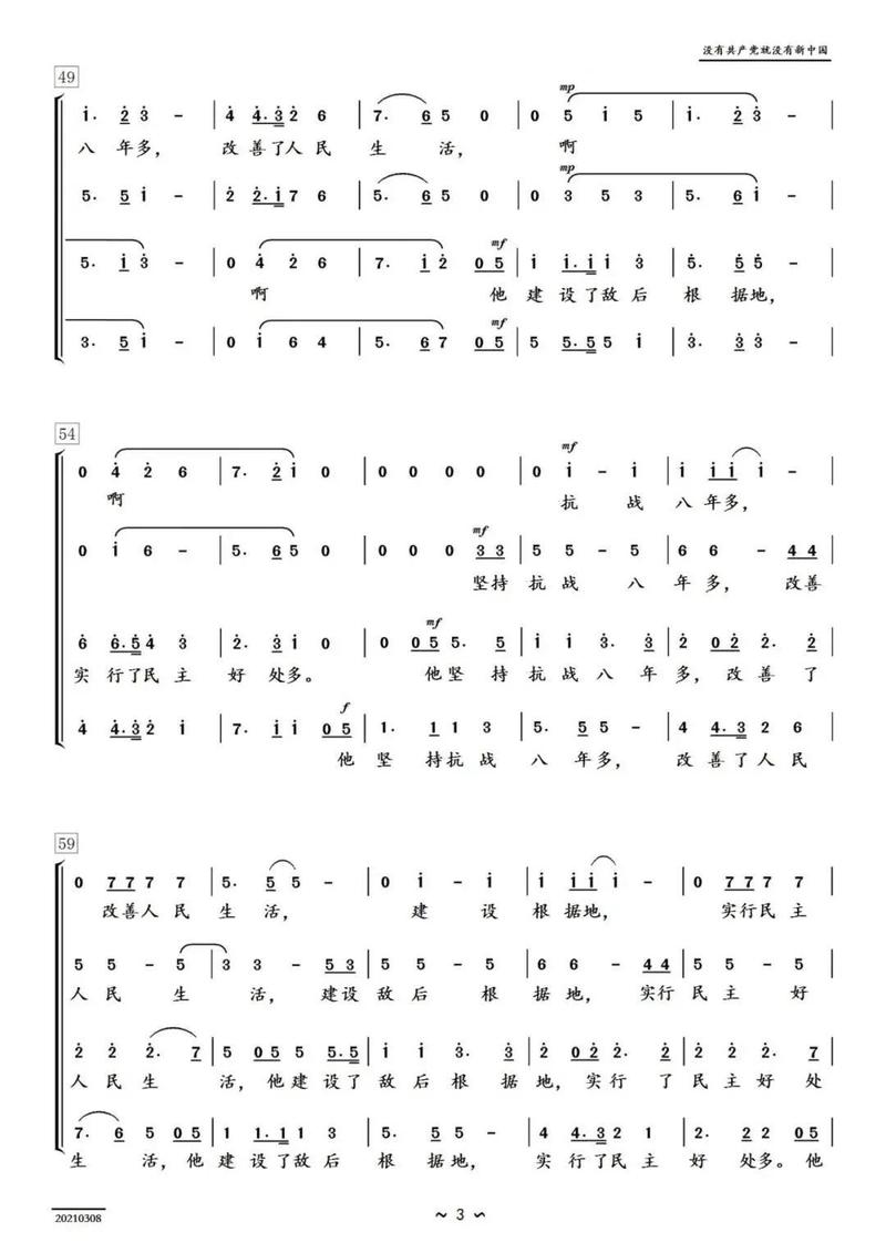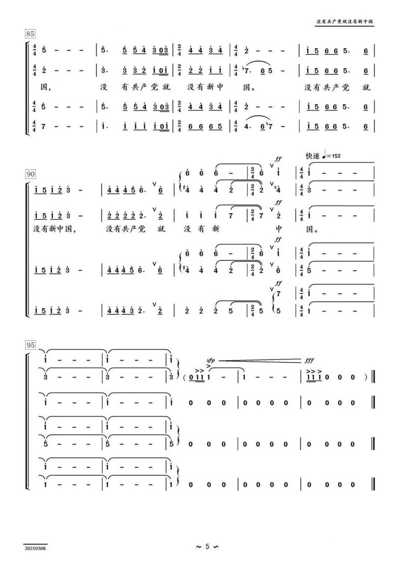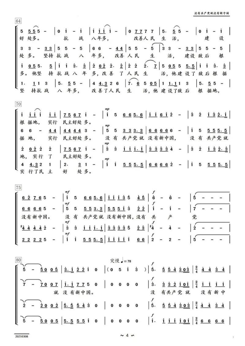混声合唱版《没有共产党就没有新中国》,从一开始充满激情的呼喊,到亲切、温暖的表达,再到富有战斗性和昂扬性的宣告,特别是那四句连续的歌唱——没有共产党就没有新中国,从中弱到中强再到强的力度变化,把人民群众发自内心的感悟,逐步外化为强烈的直接表达,这样的抒发方式是全面的,是淋漓尽致的。