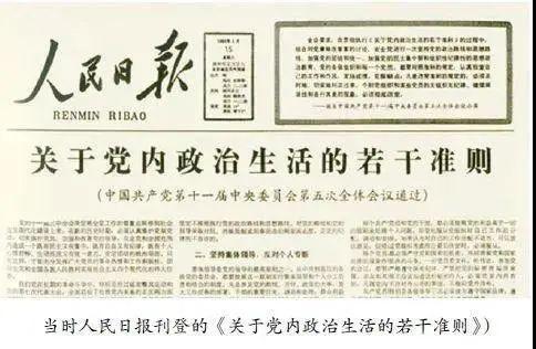 党的十一届三中全会以后,党中央采取切实措施,健全党规党法,整顿党的作风。1980年2月,党的十一届五中全会通过《关于党内政治生活的若干准则》并向全社会公布,《准则》将党章中的规定和民主集中制原则具体化,提出12个方面的要求。中纪委在一年之内就推动《准则》的施行召开了三次座谈会。《准则》的发布,对于维护党内民主统一、严肃党的纪律,保证改革开放和社会主义现代化建设顺利进行,发挥了十分重要的作用。