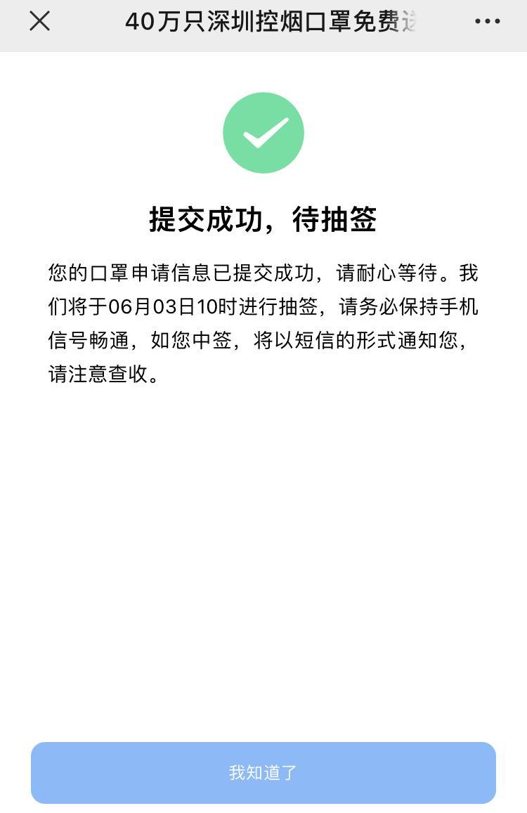 预约成功后,自动进入抽签池,等待摇号。摇号中签后即可坐等口罩包邮到家。