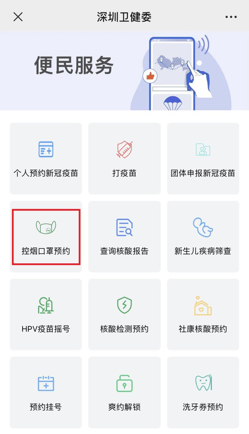 2. 点击菜单栏“便民服务-控烟口罩预约”