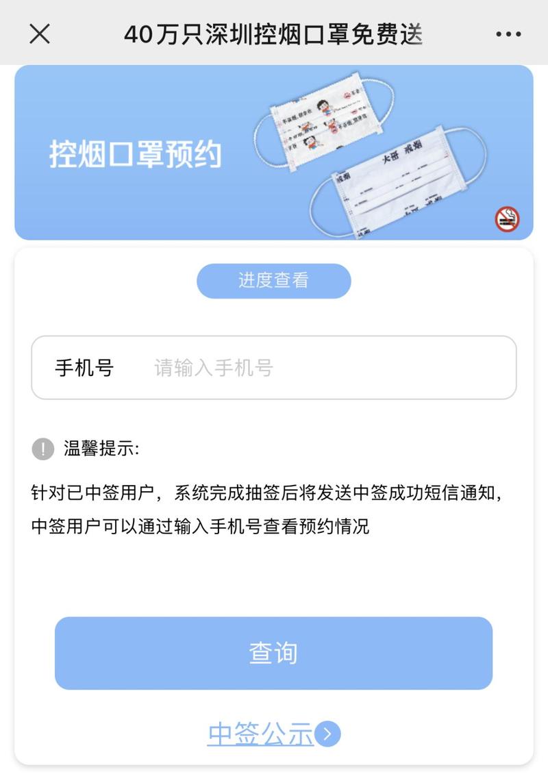 4. 登记成功后,市民可通过“深圳卫健委公众号-便民服务-控烟口罩预约-进度查看”,输入个人登记信息查询中签信息和配送进度。