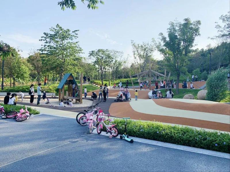 该公园是都市中的山地特色生态公园,园内自然地块与都市空间完美融合,建有儿童游乐场、景观桥、玻璃观景平台等,还有面积逾3亩的生态种植区,包含1块水稻田和9块梯田,让生活在城市的少年儿童实地观察到农作物生长的过程,了解更多生态科普知识。