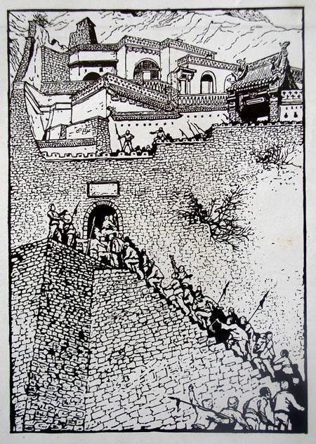 对墙的争夺使它在现代中国被赋予了较之以往任何时期更为丰富的视觉文化含义。如在中西文化碰撞和交流的历史里,建筑墙体的风格常常是文化认同的表现。在民族主义的话语里,长城——一座特殊的墙——就是中华民族的象征;而在中国革命的话语里,“土围子”,即以土或砖石为围墙的寨堡,是反动势力据点的代名词。中国现代艺术家石鲁的版画《打倒封建》(1949)描绘农民队伍冲入高墙耸立的地主庄园,就是推翻封建制度的一个形象表现。另一位艺术家彦涵在他的版画《向封建堡垒进军》(1948)中也采用了同样的象征手法。他更在画面中景的墙壁上刻画了“耕者有其田”的标语以及《中国土地法大纲》的布告,进一步强调了农民运动对于墙的占领与利用。