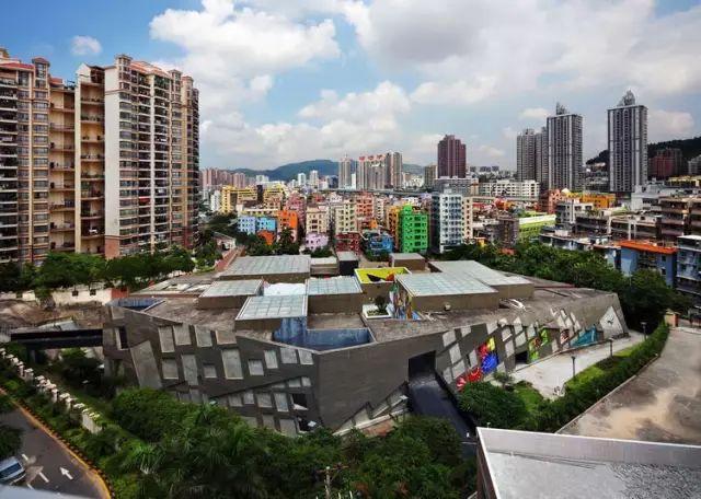 由都市实践(URBANUS)建筑师设计的大芬美术馆位于深圳龙岗区布吉街道大芬油画村的中央。近年来大芬油画村因其油画生产、创作和营销,已经名扬中外,同时也成为中国农村产业转型的一个成功案例。为了进一步提升该村园区的文化层次,地方政府斥资近亿元兴建了这座外形独特、面积为1.7万平方米的艺术殿堂。建筑共分三层,其中一层面向村子的广场,是建筑师设想的油画展示和展卖的场所;第二层是占面积一半的标准美术馆,它通过一条坡道与广场相连;第三层是一个屋顶花园,一些形如盒子的立方体或是第二层展厅的采光天井,或是可以出租的艺术工作室和咖啡厅。期间的小巷则是连接村落不同区块的通道,使得上下学的小孩和上街购物的村民都可以在这个屋顶花园里逗留。