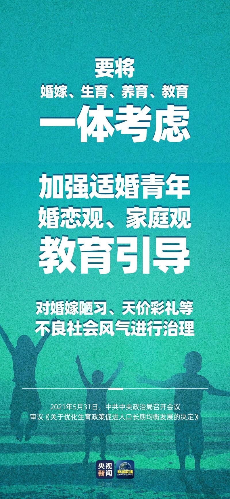 中共中央政治局5月31日召开会议,听取“十四五”时期积极应对人口老龄化重大政策举措汇报,审议《关于优化生育政策促进人口长期均衡发展的决定》。会议指出,进一步优化生育政策,实施一对夫妻可以生育三个子女政策及配套支持措施,有利于改善我国人口结构、落实积极应对人口老龄化国家战略、保持我国人力资源禀赋优势。
