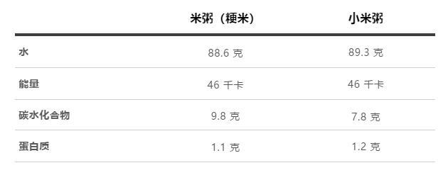 从营养成分表中我们得知,粥里面近 90% 是水,其他的主要物就是糊化的淀粉(碳水化合物)。这让它具有先天的优势:一种易消化的主食。