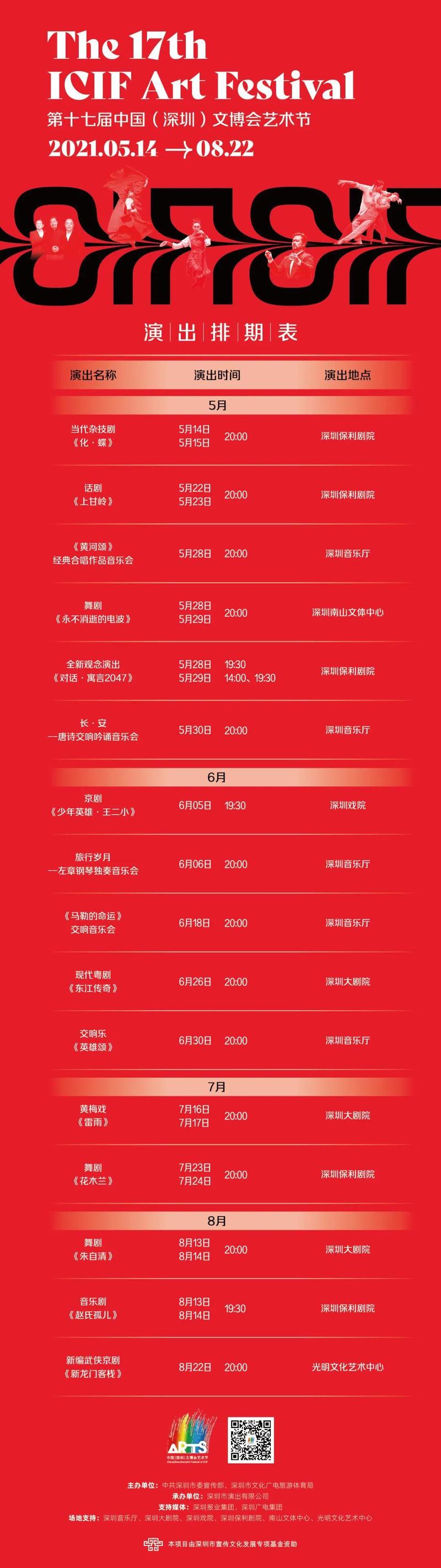 舞剧《永不消逝的电波》、话剧《上甘岭》、交响乐《英雄颂》、张艺谋导演的全新观念演出《对话·寓言2047》、新编武侠京剧《新龙门客栈》等共计16台24场优质演出,将集中在深圳大剧院、深圳音乐厅、深圳保利剧院、深圳南山文体中心、光明文化艺术中心等地上演。