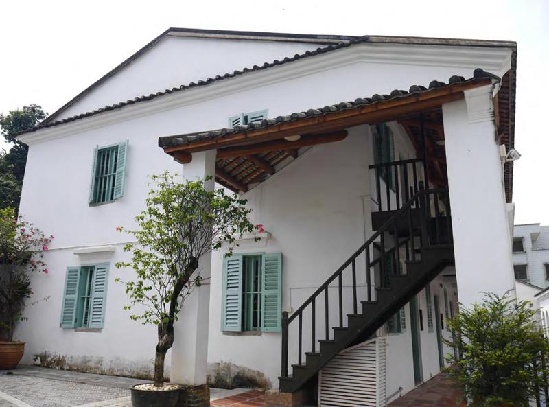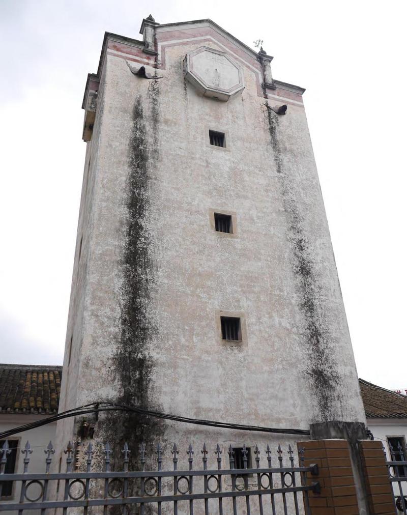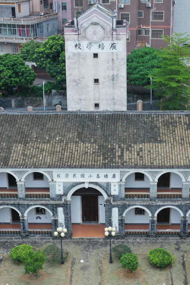 校舍后面,建有一座炮楼,正面同样自右向左写着“广培学校”四个繁体字,背面则为平整的素面。背面山墙的排水孔,做成蝙蝠样式,寓意“洪福齐天”,洋溢着浓浓的中国文化气息。
