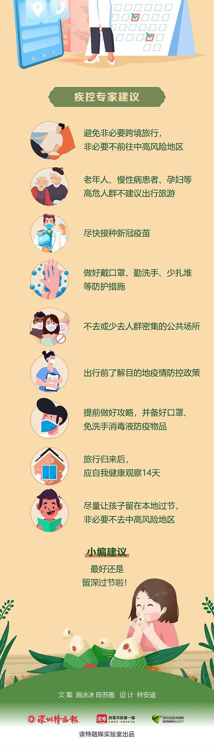 市疾控中心专家建议,端午节期间,市民非必要不离开深圳,在深圳过端午节应不去或少去人群密集的公共场所,尽量不参加聚集性活动,外出做好个人防护。端午节期间,提倡市民聚餐采取分餐制或者使用公筷公勺。