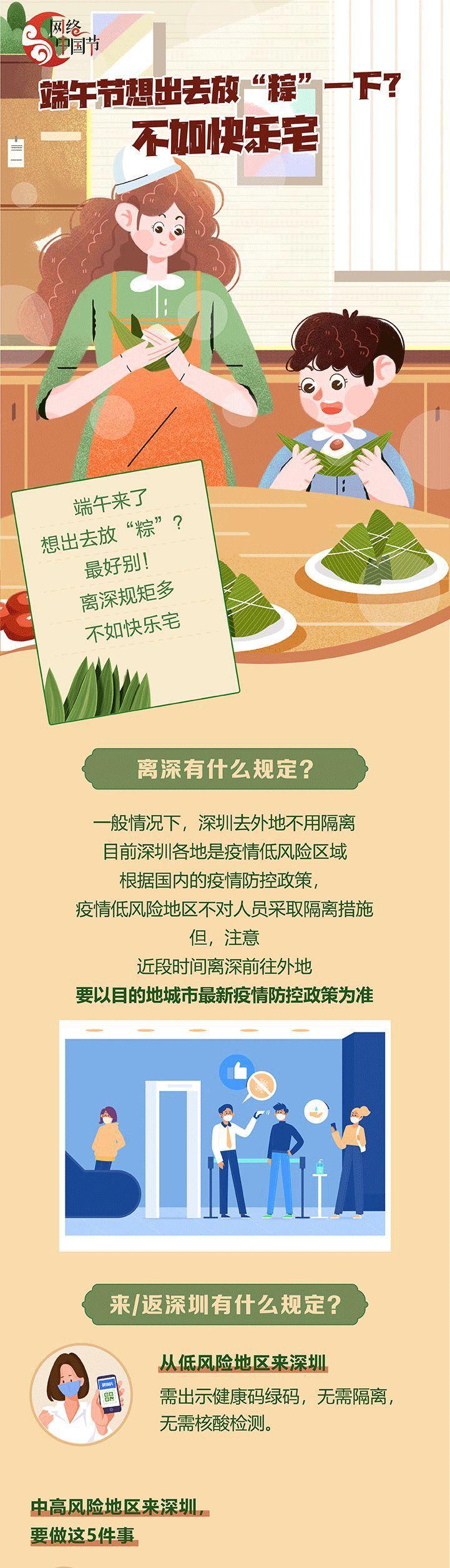 根据全市端午期间疫情防控和安全防护工作视频会议暨市新冠肺炎防控领导小组(指挥部)会议精神,深圳要按照深圳市端午节假期新冠肺炎疫情防控工作指引,暂停举办各类大型群众性活动,不组织龙舟赛、龙舟饭等人员聚集性活动,落实重点服务场所预约、错峰、限流要求,加强对各类活动的科学管控和合理引导。要继续抓好核酸检测和疫苗接种,严格落实非必要不离深要求,大力倡导端午期间就地过节,全力维护全国、全省疫情防控大局。