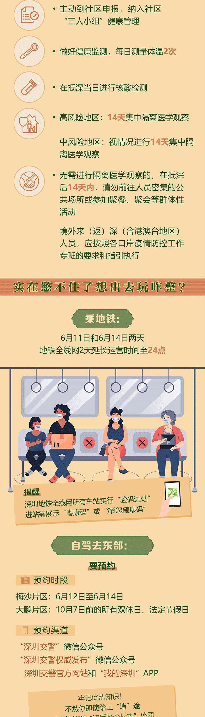 根据预测,高速公路出行方面受近期疫情防控影响,广深之间出行将有所减少,预计6月11日(假期前一天)15:00起,龙大高速公路、南光高速公路、机荷高速公路等主要高速将出现局部拥堵。因疫情防控政策要求,市内交通枢纽实行验码(粤康码)进站措施,枢纽周边道路压力较往常节假日有所提升,预计深圳火车站、深圳北站、深圳宝安国际机场等市内交通枢纽的拥堵高峰将集中在6月11日(假期前一天)。