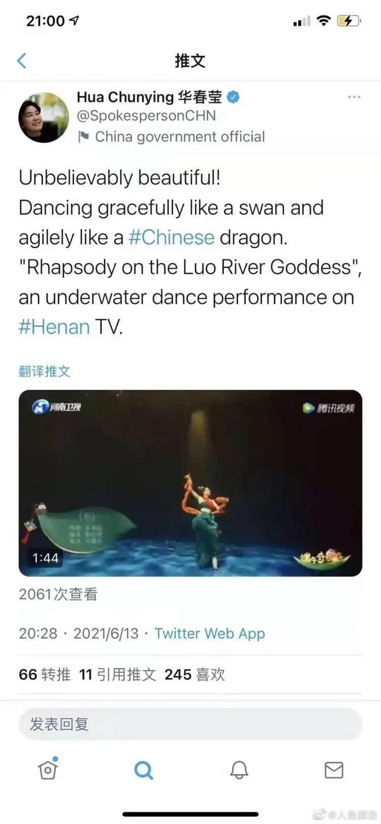 6月12日晚在河南卫视首播后,迅速通过网络媒体火遍全网。不仅人民日报、新华社纷纷转发,6月13日晚,外交部新闻司司长华春莹在个人推特账户上也点赞: