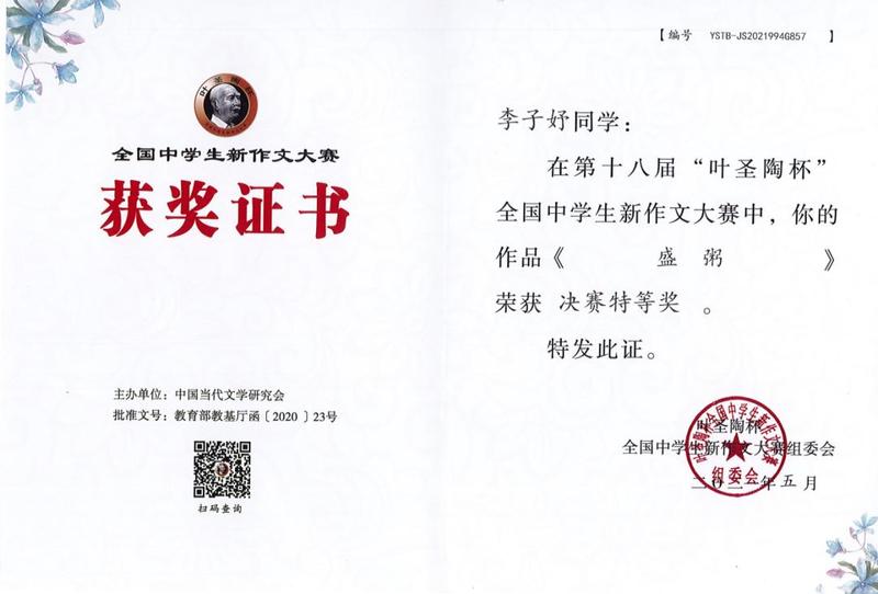 第18届“叶圣陶杯”,李子妤荣获决赛特等奖