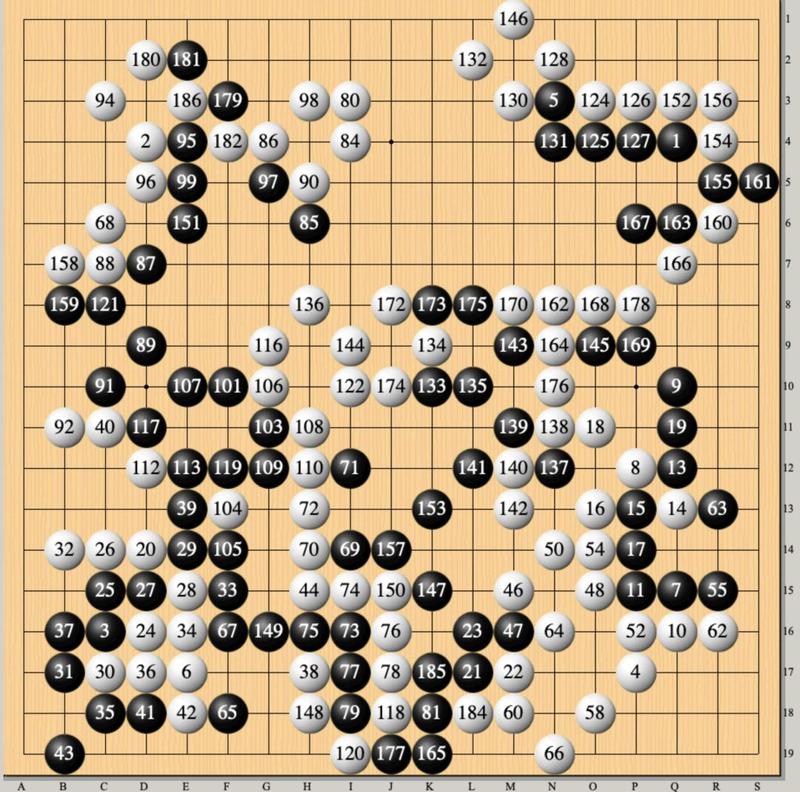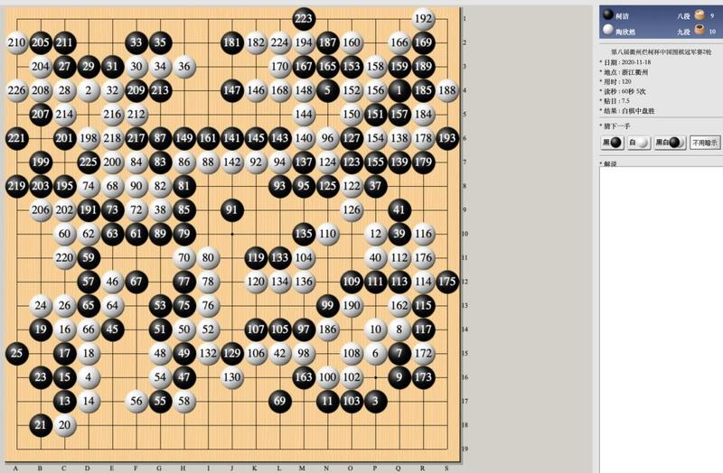 这盘棋执黑的柯洁序盘先是左下吃了点小亏,紧接着黑棋在右下用强,双方形成劫争,转换后陶欣然白棋胜率已是99%,胜负就此失去悬念,至186手陶欣然中盘获胜。