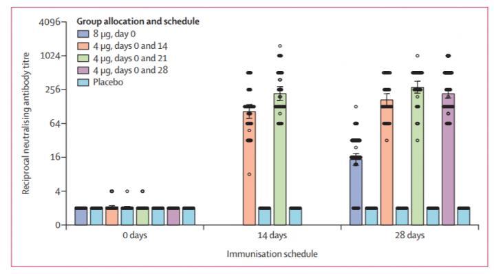 2020年10月,《柳叶刀·传染病》发表了国药集团北京生物制品研究所研发的新冠灭活疫苗I/II期试验的结果显示:在0天和21天、0天和28天接种两剂4微克疫苗产生了高水平的抗体反应。