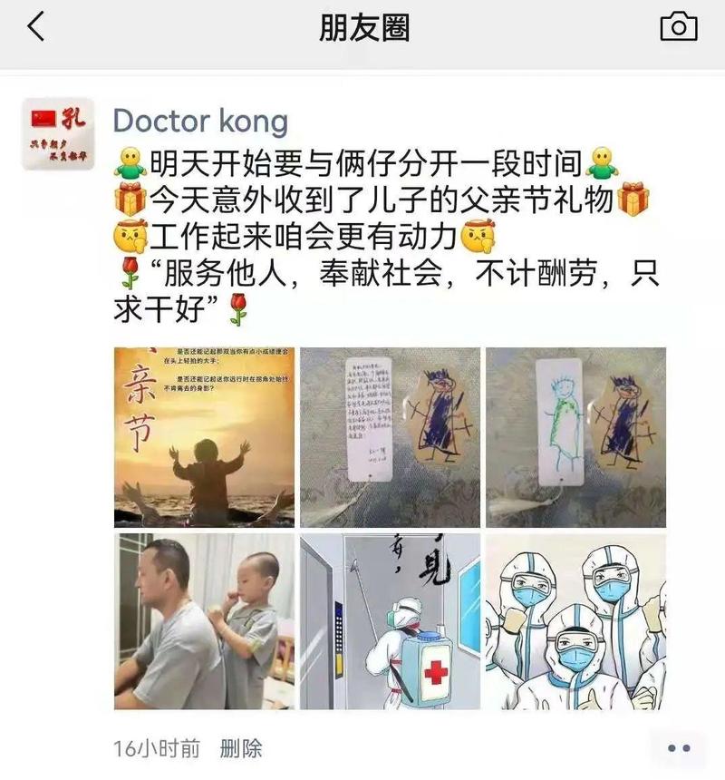 由于长期在隔离酒店驻守,接下来,他至少一个月不能回家,更无法与孩子一起度过这个专属的节日。隔离酒店里入住的是境外入境人员,驻守在酒店里的医护人员属于高风险的接触岗位。出发前一天,孔程详在朋友圈分享了孩子制作的礼物,并写道:“服务他人,奉献社会,不计酬劳,只求干好。”