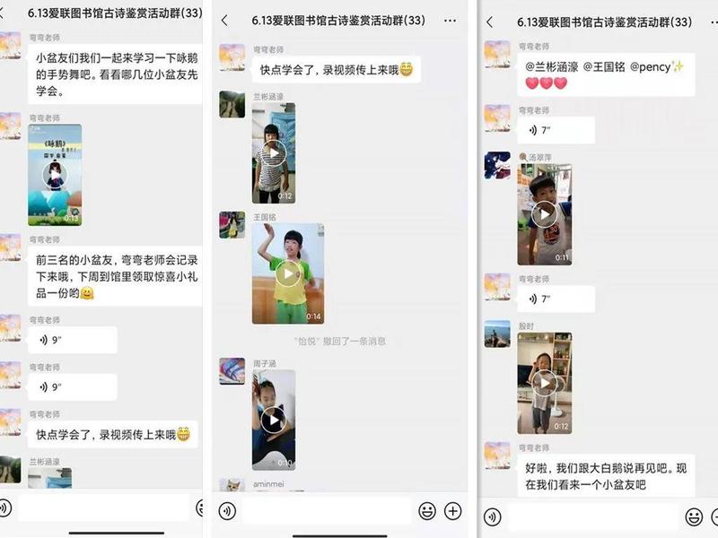 活动开始前,小读者在活动群里用语言进行了自我介绍,在互动过后,弯弯老师为大家带来了一段《咏鹅》的手势舞。
