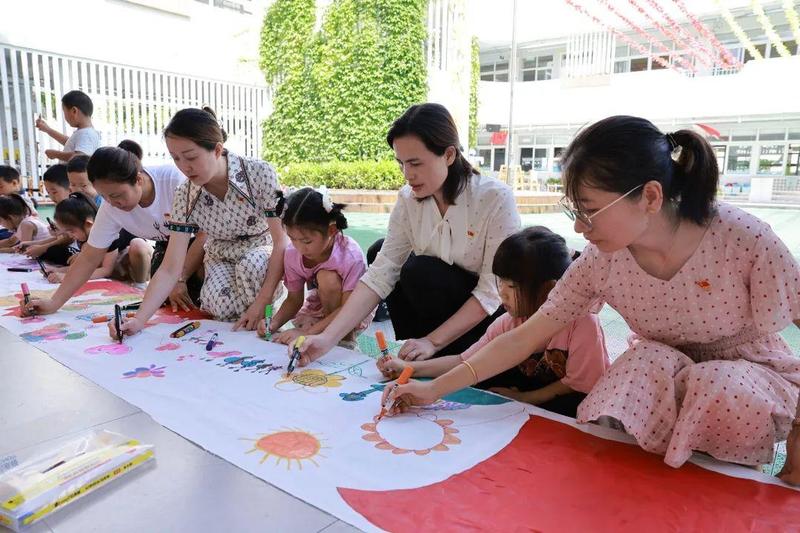 在百米画卷映党心的绘画活动中,孩子们用画笔描绘祖国的模样,用心叙述对党和国家的爱!