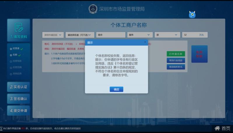 (4)若企业名称不符合标准,校验失败,则系统会弹出报错信息,客户需要对个体户名称修改后再次点击“名称校验”。