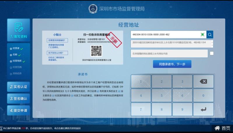 经营者手动输入或是通过二维码扫码功能,录入25位房屋编码后点击搜索,获取经营地址详细信息,如需补充地址内容则勾选,完成填写后,点击“同意承诺书,下一步”。