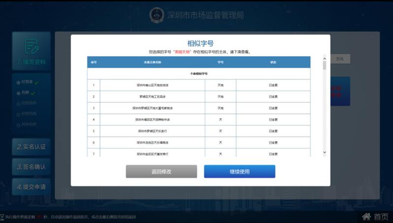 (2)名称校验过程中,界面展示个体户、企业、主体中具有相似字号的主体名称、字号、状态信息,经营者通过下滑、上下页完整查看相似信息后,可根据情况选择是否修改,点击“继续使用”继续进行名称校验。