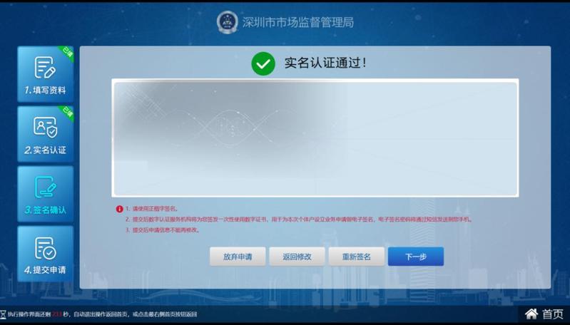经营者确认资料信息填写无误,进入实名认证页面,营业执照自助领证机拍照经过后台核实身份,实名认证通过,自动跳转签名页面。