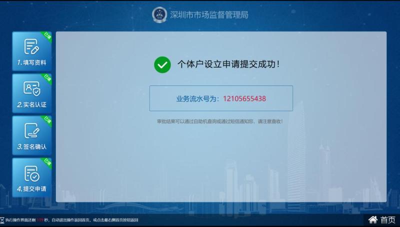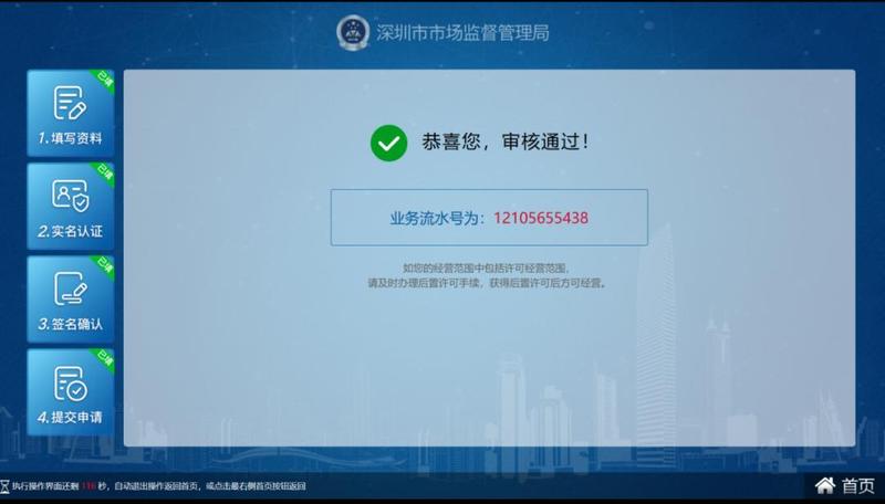 经营者完成信息提交,等待审核,审核结果可通过营业执照自助领证机查询或等待短信告知。