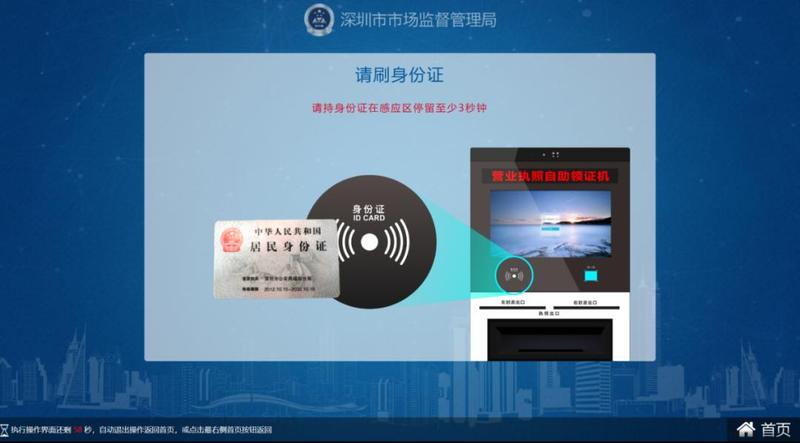 经营者本人点击营业执照自助领证机“个体户设立”,进行商事登记申请,根据系统提示在身份证感应区放上身份证,停留至少3秒钟等待读取身份证信息。