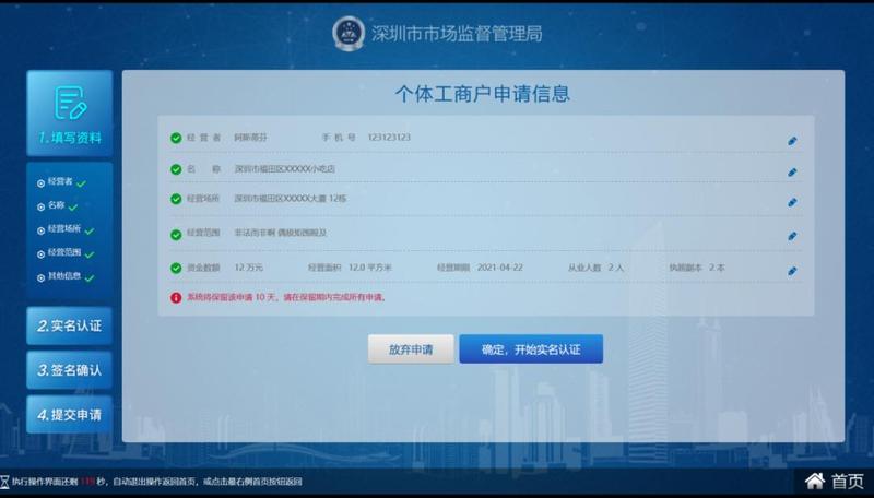 资料填写完毕,界面展示填写的各项信息,经营者可通过点击编辑,修改填写资料,若不想申请,点击“放弃申请”,若想继续申请,点击“确定,开始实名认证” 。