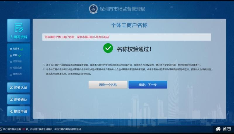 (3)名称校验通过,界面展示最终校验通过的名称,经营则可根据情况选择是否更换名称,选择“再换一个名称”更换名称(重新进入名称填写页面),名称确定后,点击“确定,下一步”。