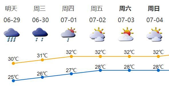 29-30日有雷阵雨,局部暴雨,强降雨较大可能出现在凌晨至上午,29日气温25-30℃;