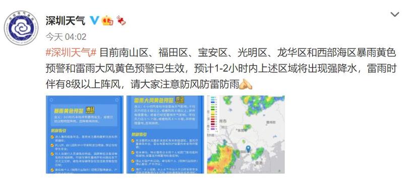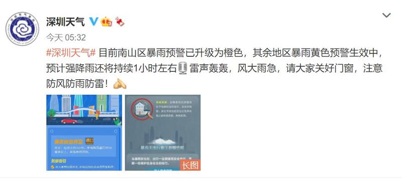 05:15深圳天气将南山区暴雨黄色预警升级为橙色、暴雨黄色预警扩展至全市。