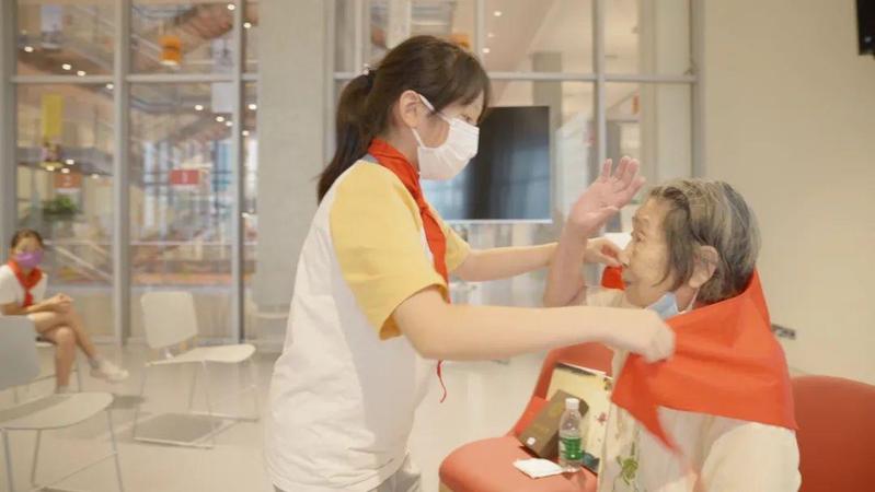 ▲ 荟同少先队员为陈奶奶献上红领巾