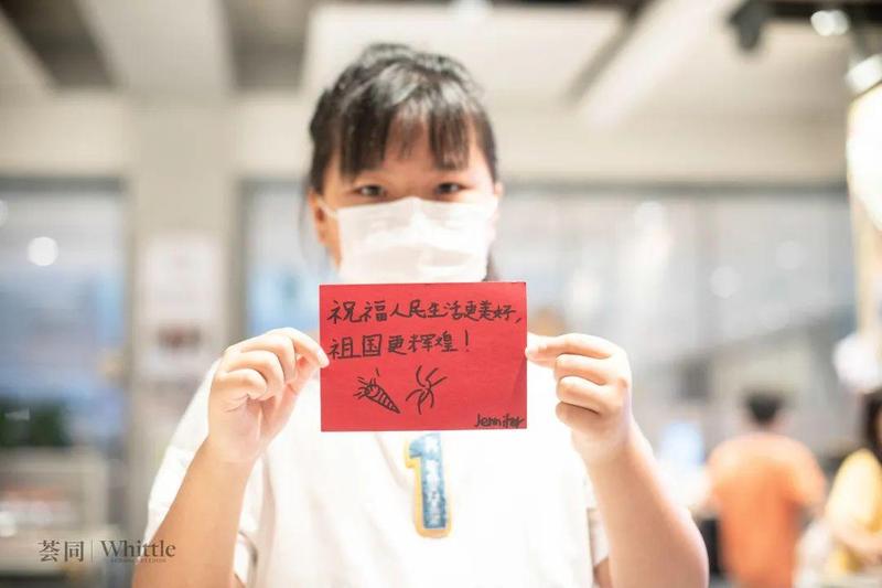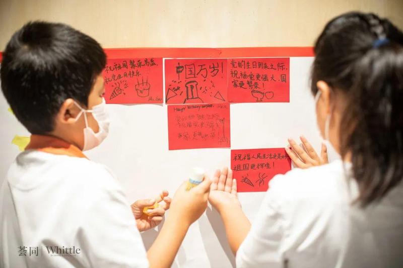 低年级同学们在荟同创意设计部高雅安老师的带领下,用红色卡纸做成贺卡,亲手写下对党和祖国的祝福,贴在党旗的红色位置。