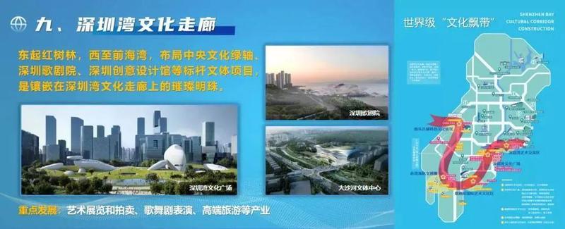 东起红树林、西至前海湾,加快建设“超级十字”中央文化绿轴、深圳创意设计馆、科技生活馆、深圳歌剧院、海防博物馆等标杆文体项目,重点发展艺术展览和拍卖、歌舞剧表演、高端旅游等产业,引领文创产业飘向未来。