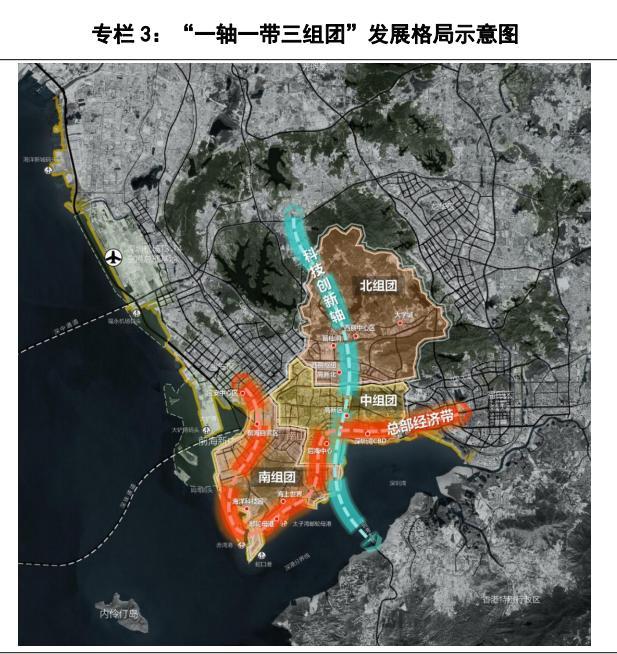三组团:北部、中部和南部三大组团,北部组团涵盖西丽、桃源街道,以西丽湖国际科教城、西丽高铁新城为重点,打造集科研教育、高铁枢纽、生态涵养于一体的协调发展示范片区;中部组团涵盖粤海、沙河、南头街道,以高新区、华侨城片区、南头古城为重点,打造集高新技术、文化创意、文脉传承于一体的创新发展示范片区;南部组团涵盖南山、蛇口、招商街道,以前海、蛇口国际海洋城为重点,打造集深港合作、海洋经济、国际交往于一体的开放发展示范片区。