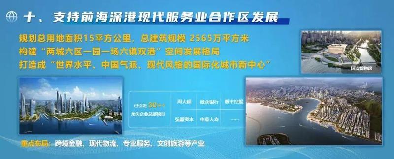 重点布局跨境金融、现代物流、专业服务、文创旅游等产业,打造成世界水平、中国气派、现代风格的国际化城市新中心。