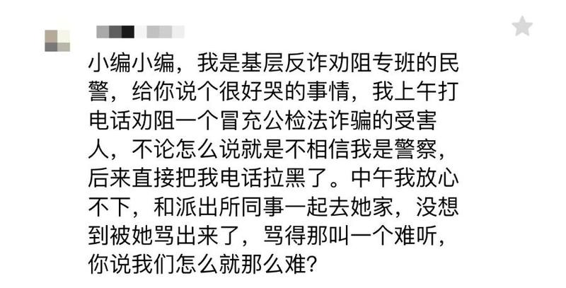 这种情况并不少见,特别是在冒充公检法类型的诈骗中,很多反诈民警的遭遇几乎和上面这位留言的读者一样,不但没劝阻成功,反而被气得肝疼。今天,二弟就来深层次分析一下问题到底出在哪?文末还有真实劝阻录音解构,不要错过。