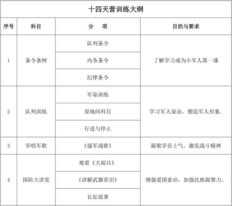 “新长征少年”军事夏令营,采用全封闭式军事化管理,以铁的军事纪律和严格的军事训练,加强学员的自理自立能力。着重配乐青少年行为习惯,从日常生活中贯彻条例,从细节和小事当中培养学员严谨细致和雷厉风行的军人作风,做一个新时代的阳光少年。
