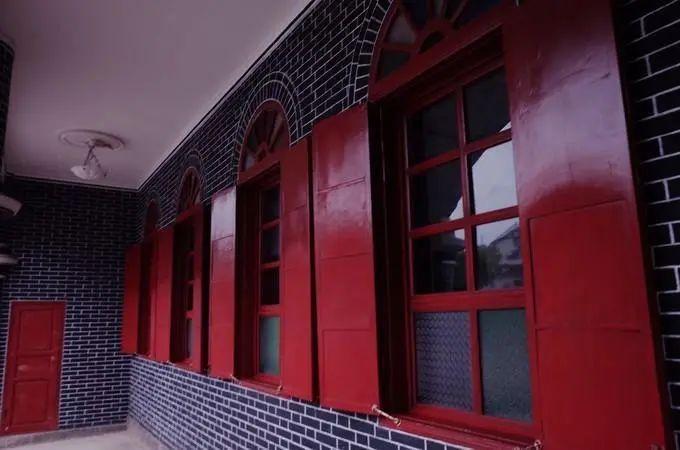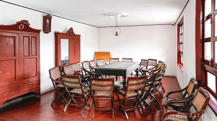 会址主楼上下的门窗,漆板栗色,所有窗牖均镶嵌彩色玻璃。楼层走廊上,可以凭眺四围苍翠挺拔的群山,指点昔日红军二占遵义时与敌军鏖战地——红花岗、插旗山、玉屏山、凤凰山诸峰。