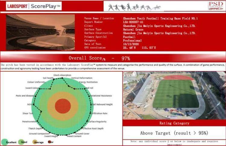 天然草球场达到国际足联认可实验室Labosport分级评定的专业竞赛球场认定标准;