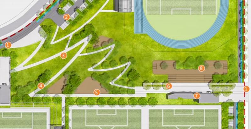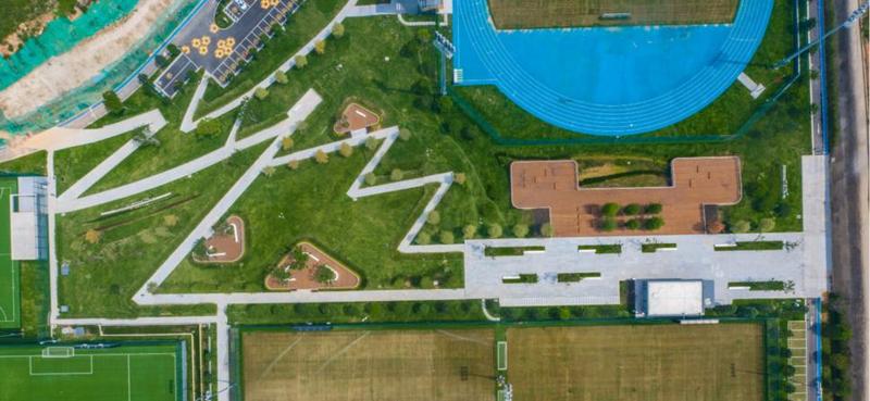 通过一条长约3千米的环形跑道连接8个不同高差的足球场地,并重点营造贯通主次入口的景观场所,设计团队摈弃既定方式,通过创新设计手段把高差难点转变成景观特点,引入“之”字形折线坡道的设计手法。