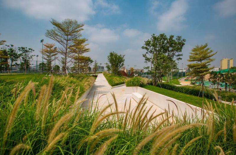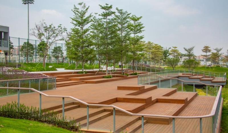 沿着“之”字形通道,凤凰木、锦叶榄仁、丛生朴树打造舒朗通透的绿荫林下空间。随风摇曳自然野趣的狼尾草、造型蓬松可爱的狐尾天门冬、柳叶马鞭草,营造了丰富明快的植物韵律。阶梯式竹木平台的设置,让市民无须入场便可观看顶级赛事,同时为市民举办多样化活动提供场所。