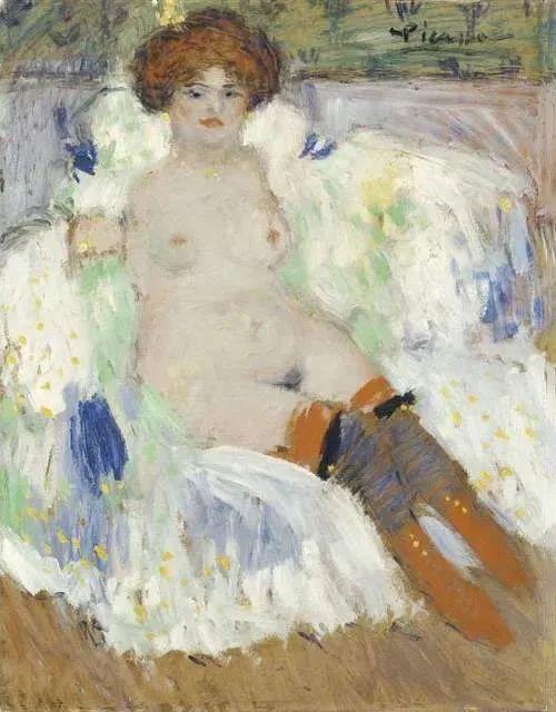 巴勃罗·毕加索《穿红色丝袜的裸体》,布面油画,66.5 x 52厘米, 1901
