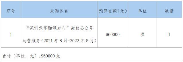 为进一步推进龙华区媒体深度融合发展,落实“移动优先”战略,更好宣传“数字龙华、都市核心”形象,更好引导群众、服务群众,拟选定一家有资质的机构于2021-2022年期间,为“深圳龙华融媒发布”公众号提供为期1年的运营服务。